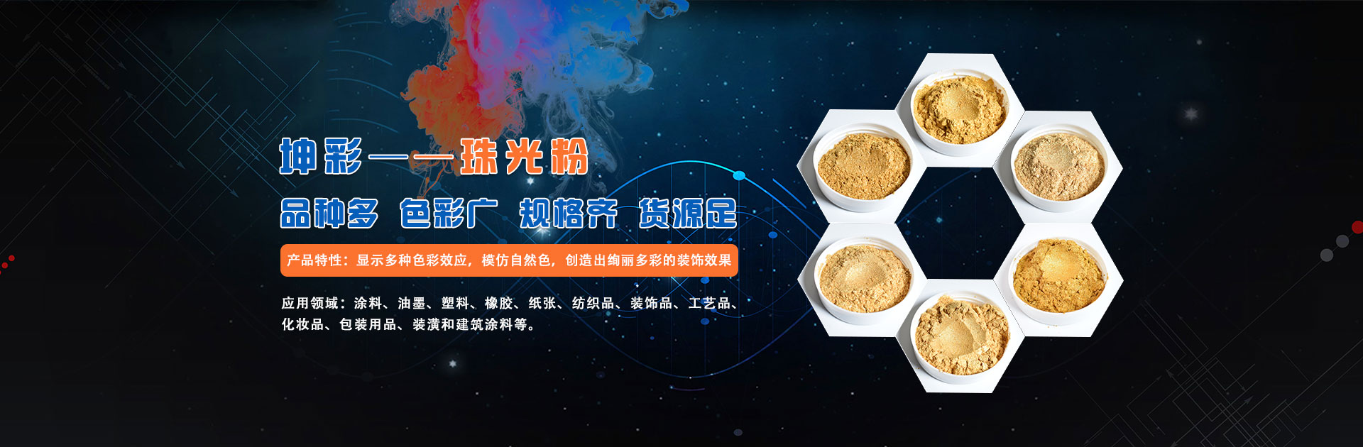 公司精選國際精品顏料,匯集全球品牌。品種多、色彩廣、規格齊、貨源足。主要產品有金蔥粉、珠光顏料、熒光顏料、鋁銀漿、珠光漿、金粉、銀粉、反光粉、夜光粉、銅金粉、色精、有機顏料等上千種品種。……
